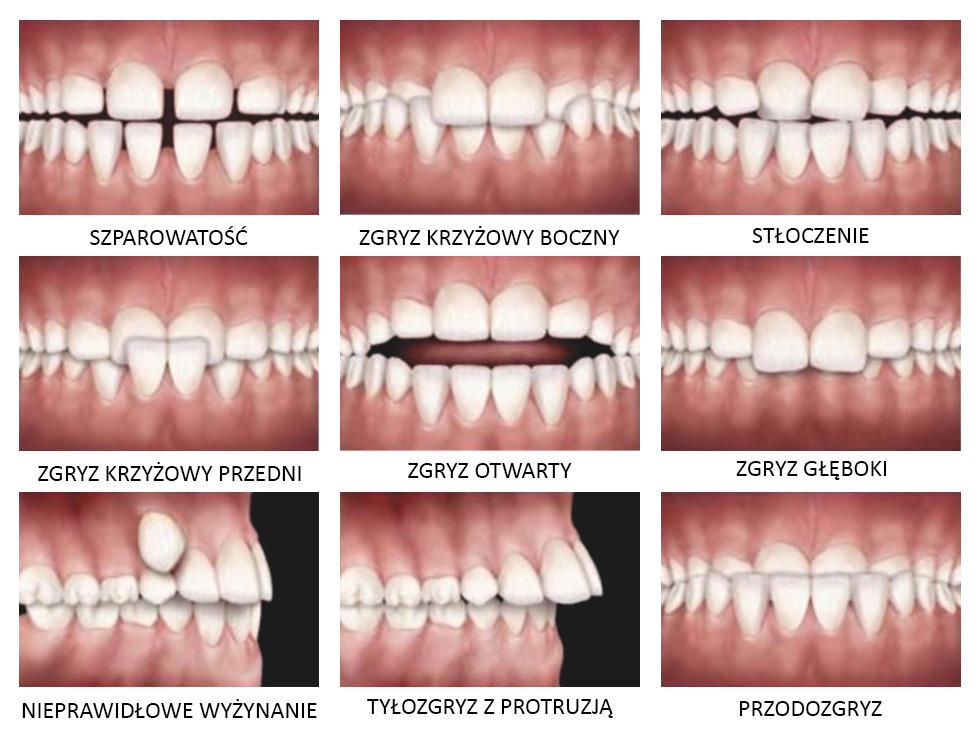 Wyróżniamy kilkanaście wad zgryzu ,wywołanych przez różne czynniki wrodzone i nabyte.